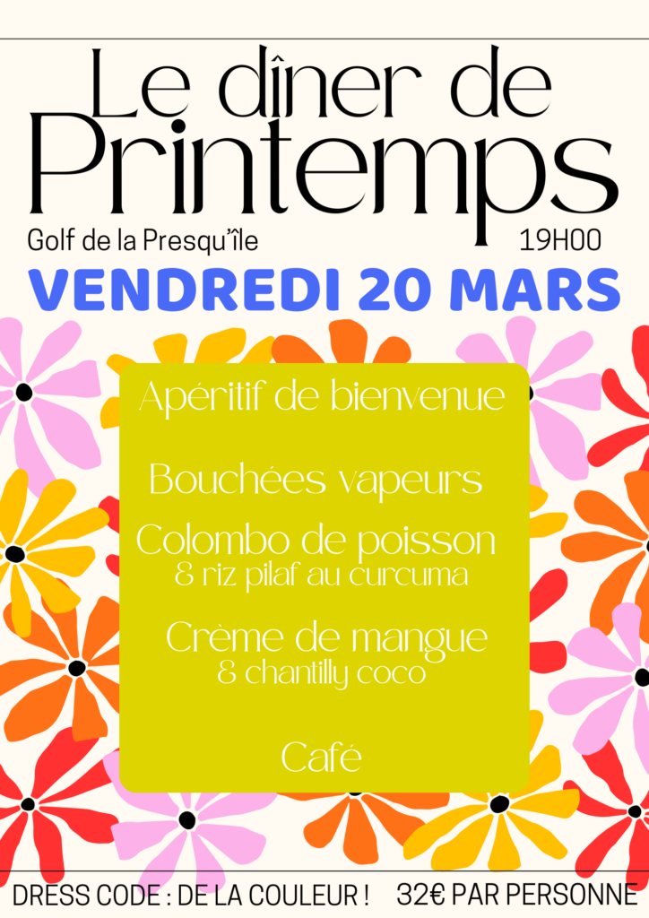 Enfin, nous espérons vous retrouver nombreux lors de notre dîner de printemps, le vendredi 20 mars au soir. Une belle soirée pour célébrer ensemble le retour des beaux jours et lancer officiellement la saison.