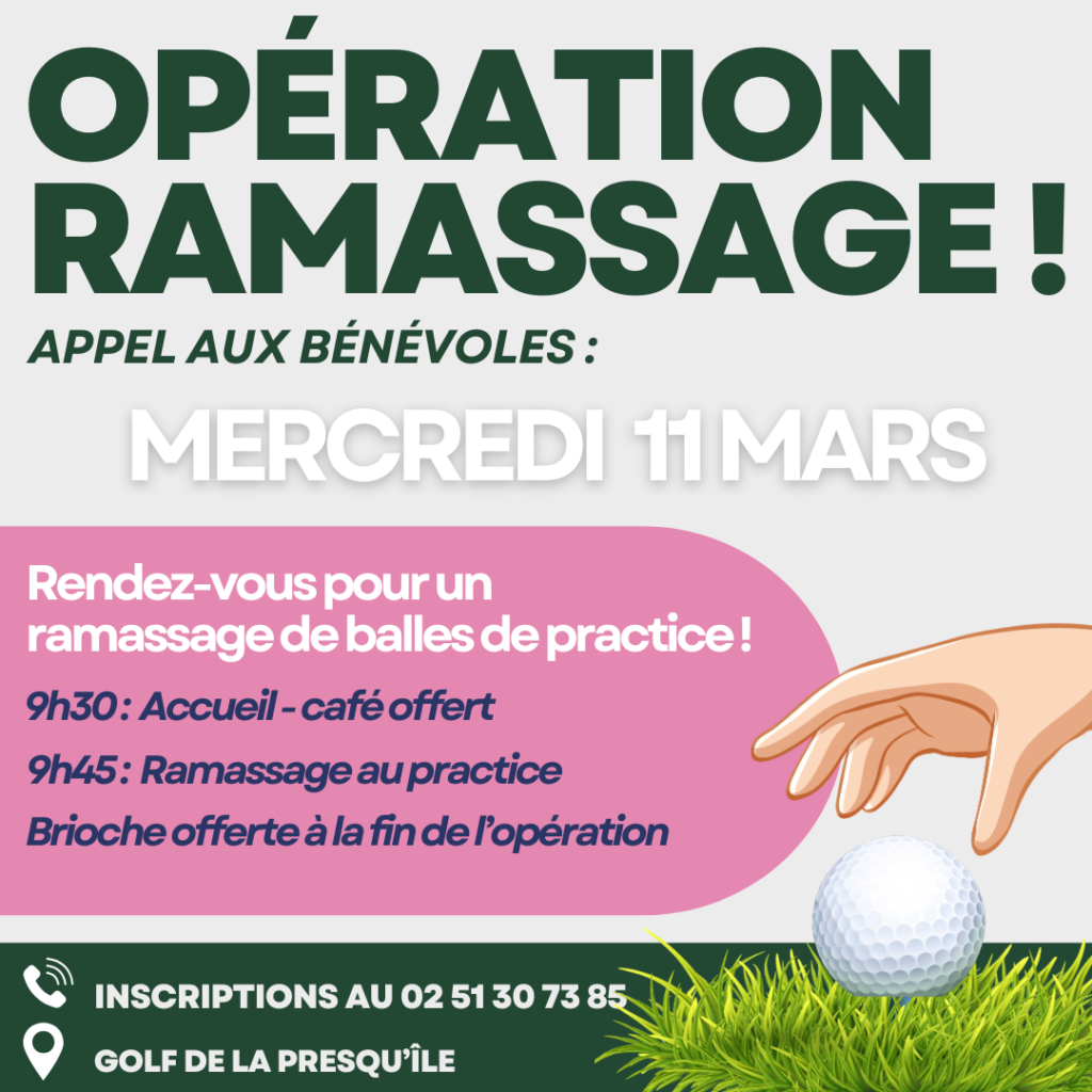 Cette opération consiste à récupérer manuellement les balles de practice bloquées aux quatre coins du terrain. Un coup de main essentiel pour le bon fonctionnement du club, que nous ne pouvons réaliser sans vous.🙏 Un grand merci par avance pour votre mobilisation.