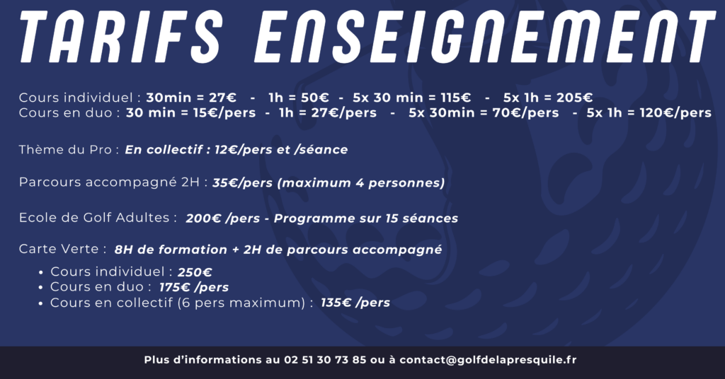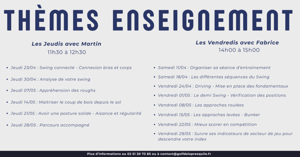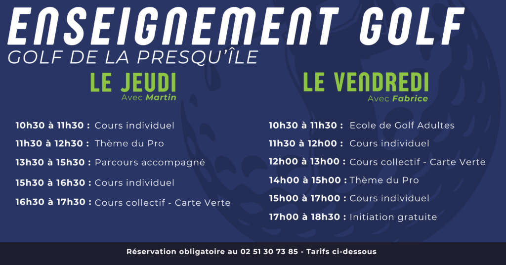 Nous avons le plaisir de vous présenter nos toutes nouvelles formules d’enseignement, pensées pour répondre aux attentes de tous : golfeurs et golfeuses confirmés, joueurs en quête de progression… et même celles et ceux qui souhaitent s’initier à ce sport passionnant !